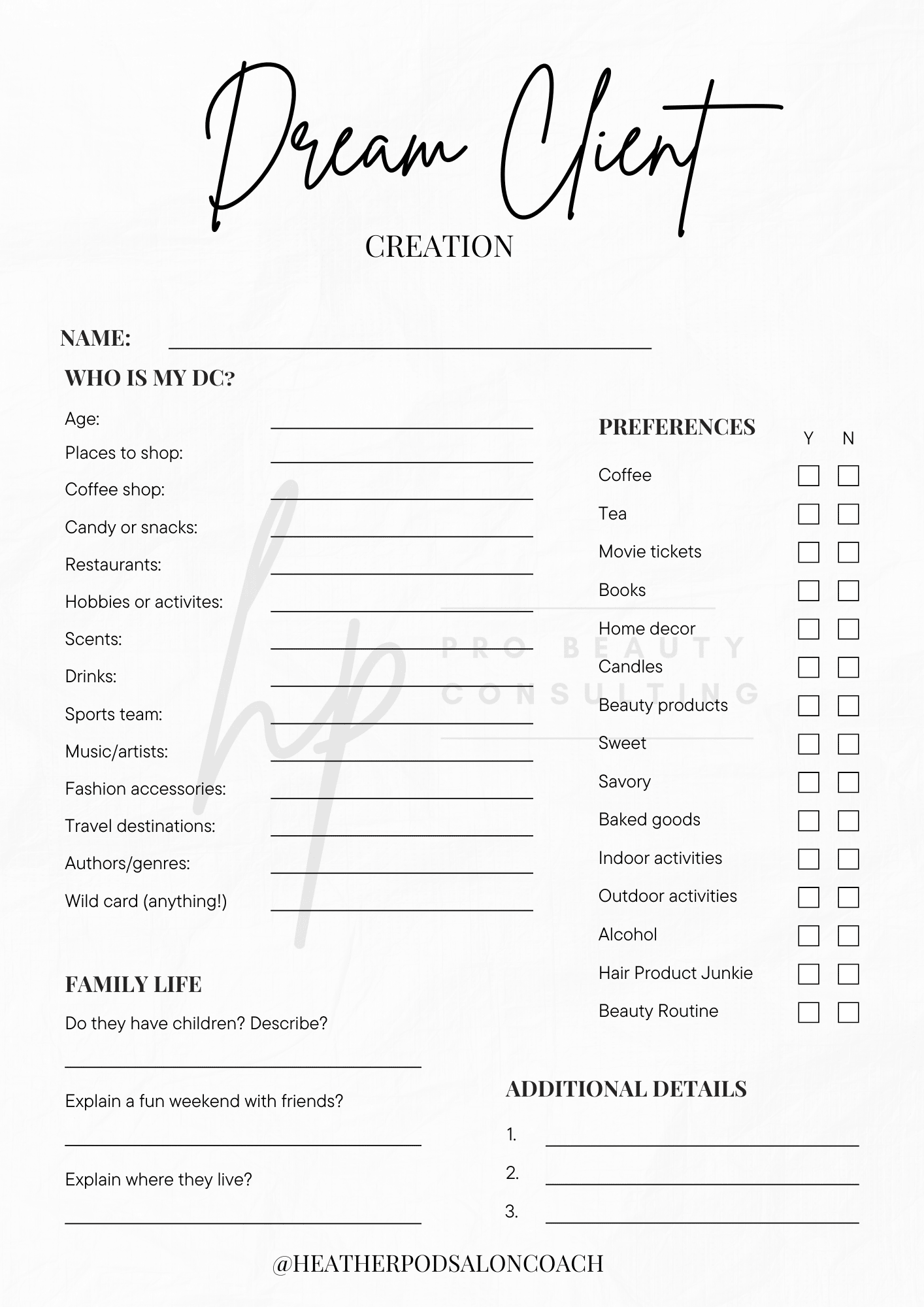 Start with a clear mind. Think about the exact client or guest that you want based on your personal branding. Fill our everything except the name. Once you have filled everything out, NAME her (or him)! This avatar will now be exactly who you speak to in all your marketing.